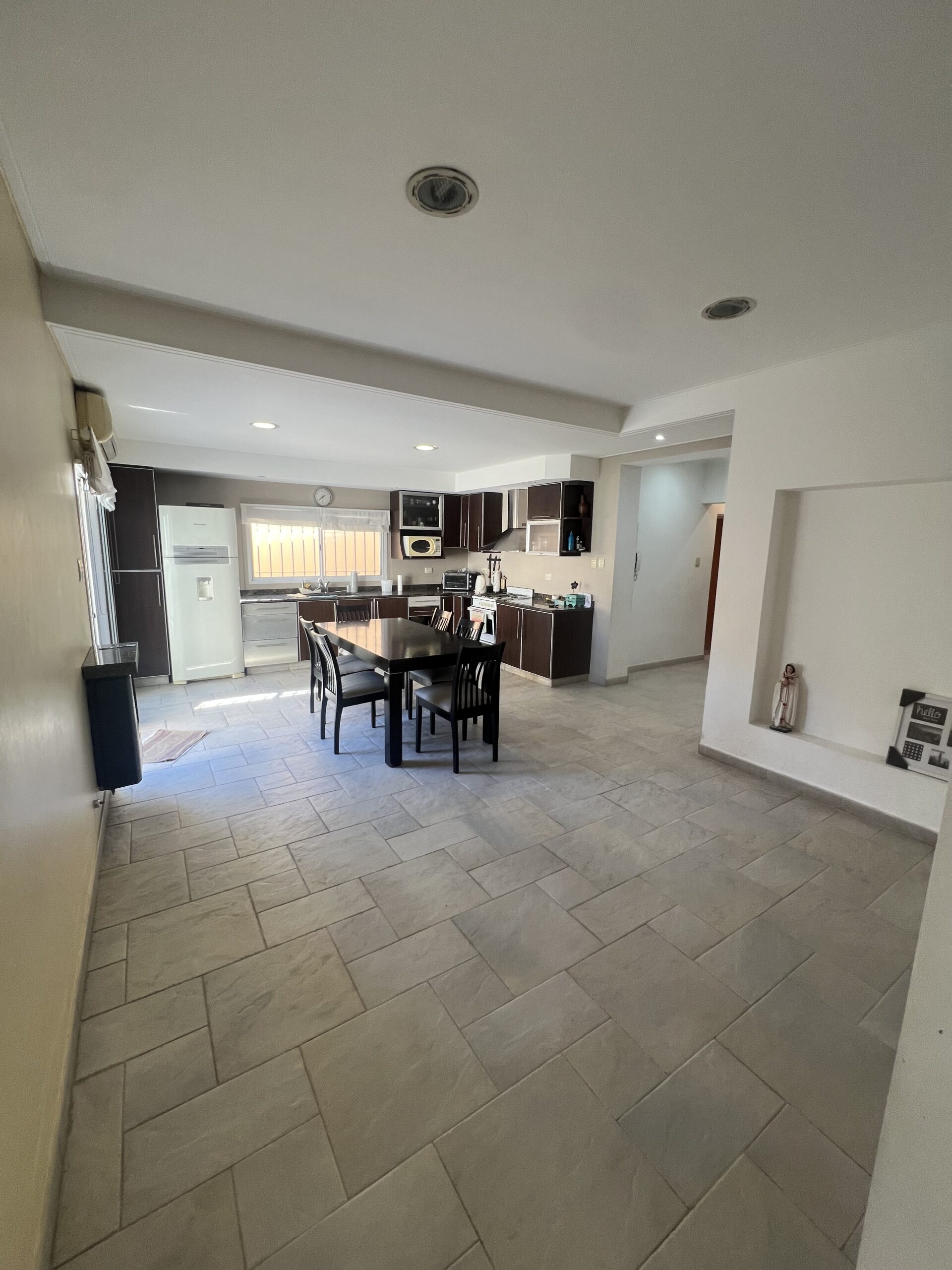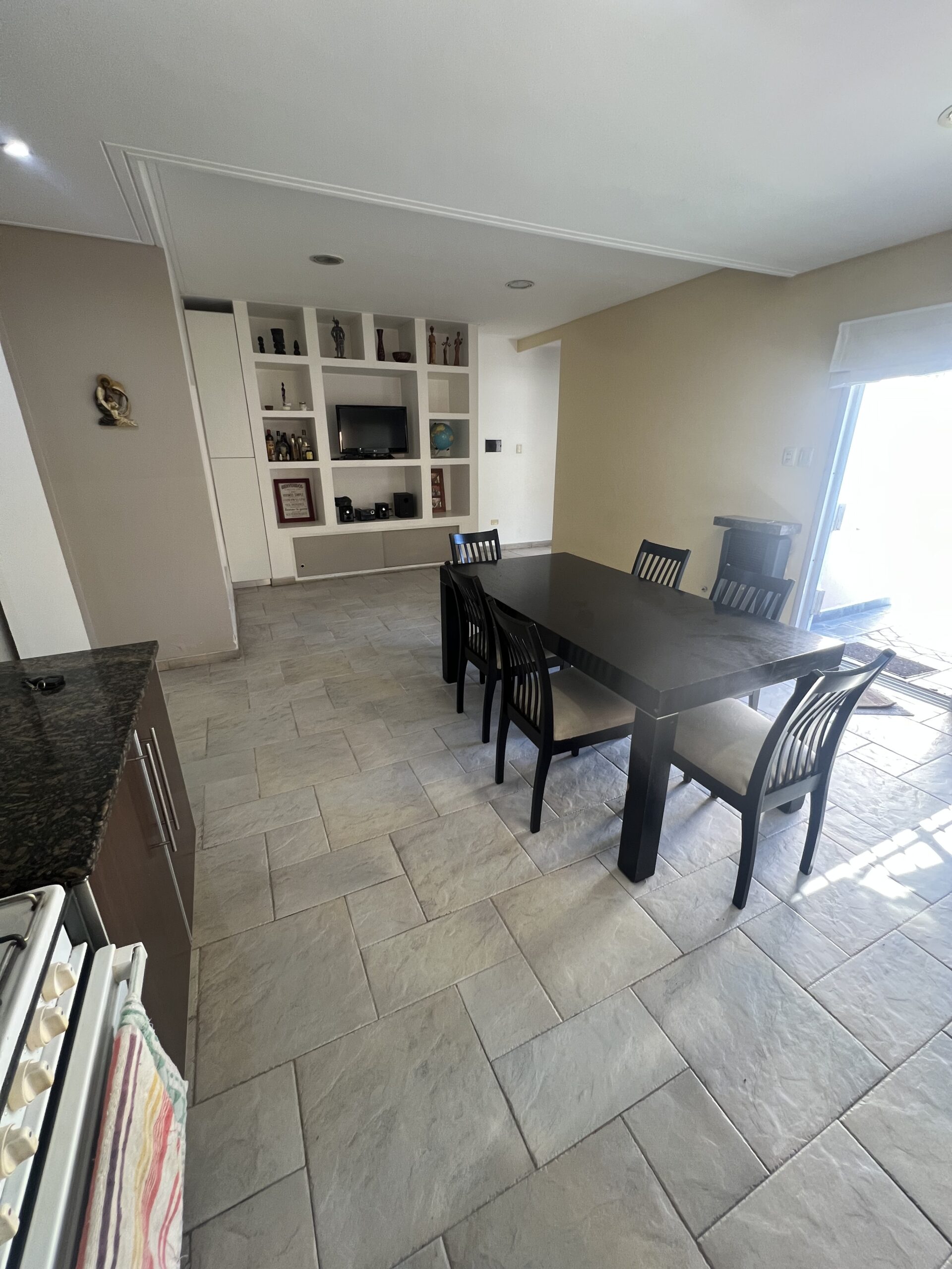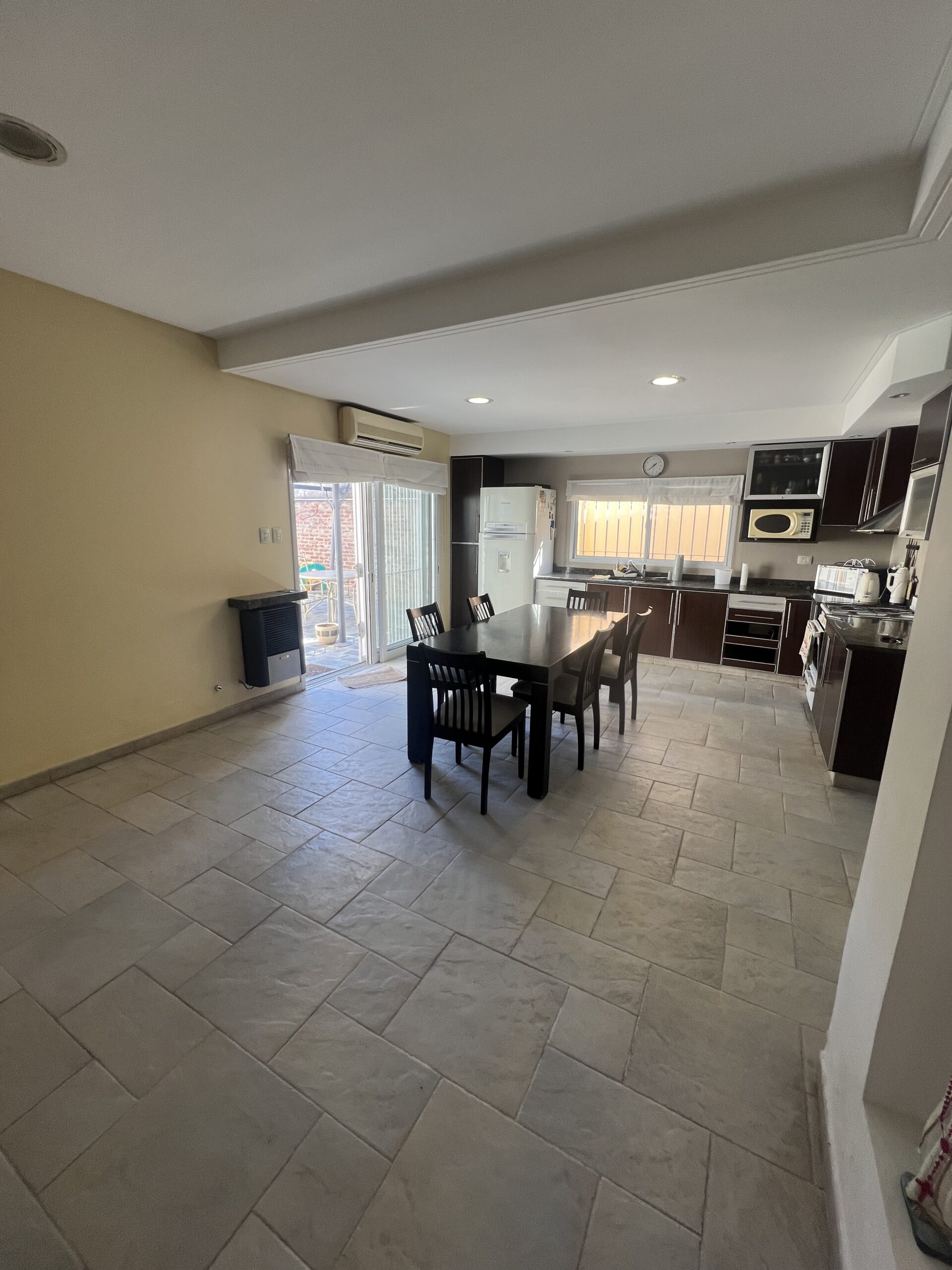 La cocina comedor es amplia y funcional, equipada con muebles sobre y bajo mesada, extractor, mueble frontal para TV y espacio de guardado, aire acondicionado y estufa a gas. Desde este ambiente se accede directamente al parque.