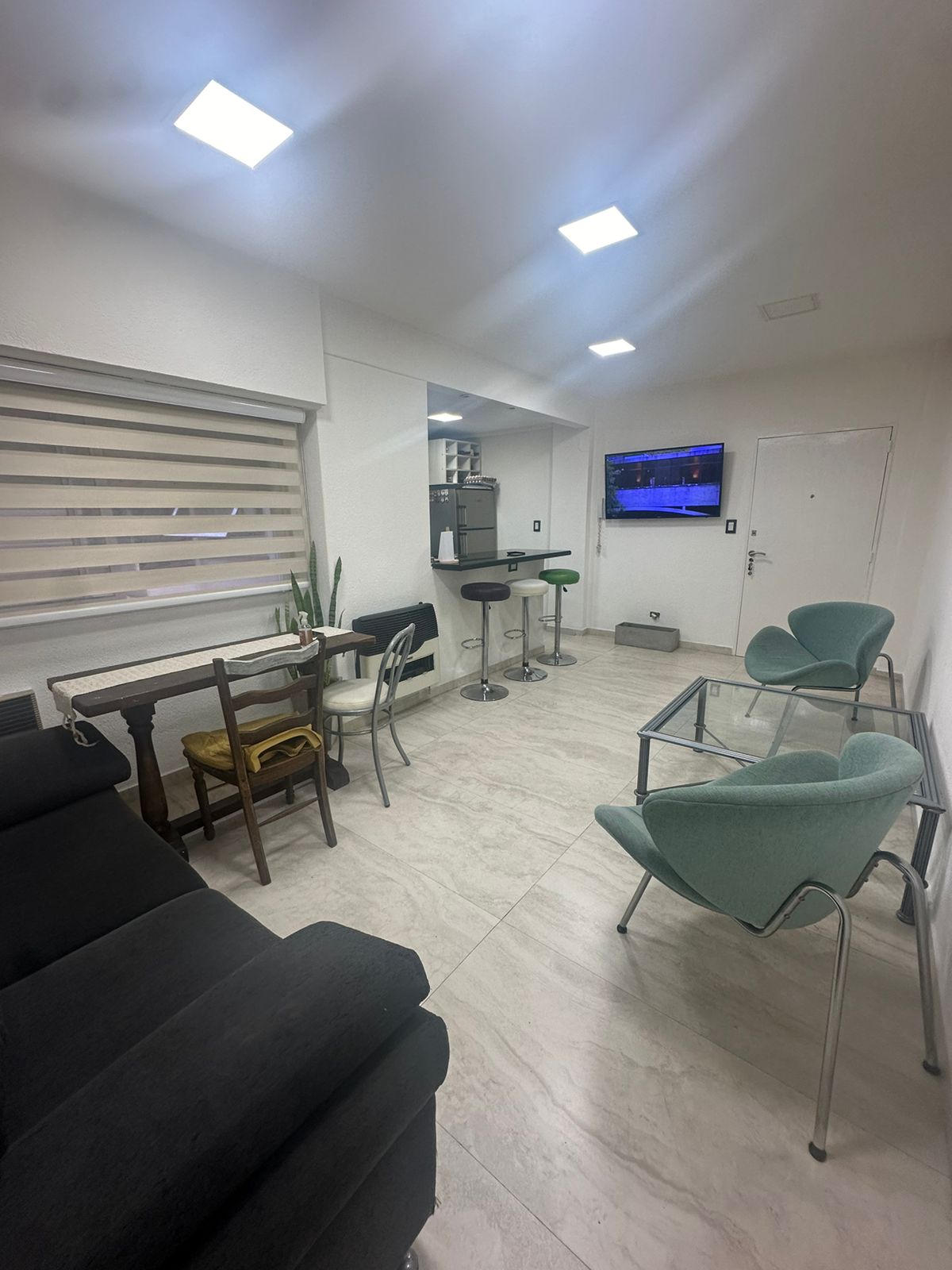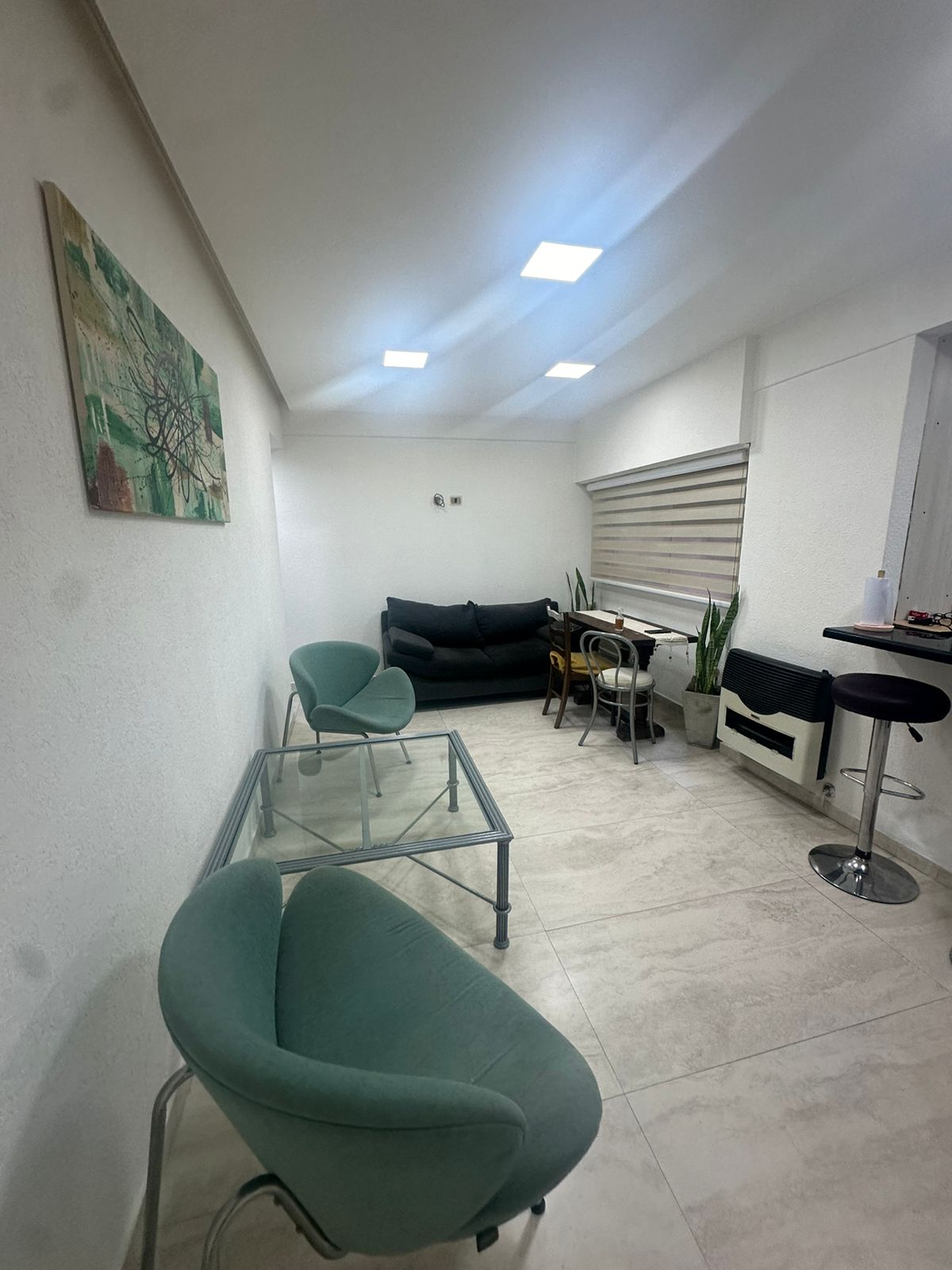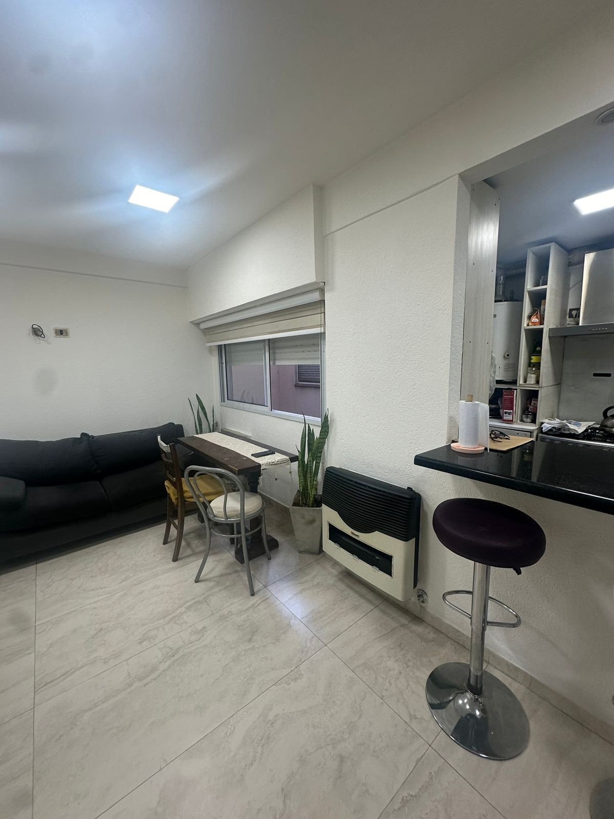 Living comedor con estufa de tiro balanceado y aire acondicionado frío.