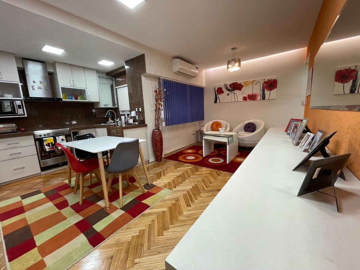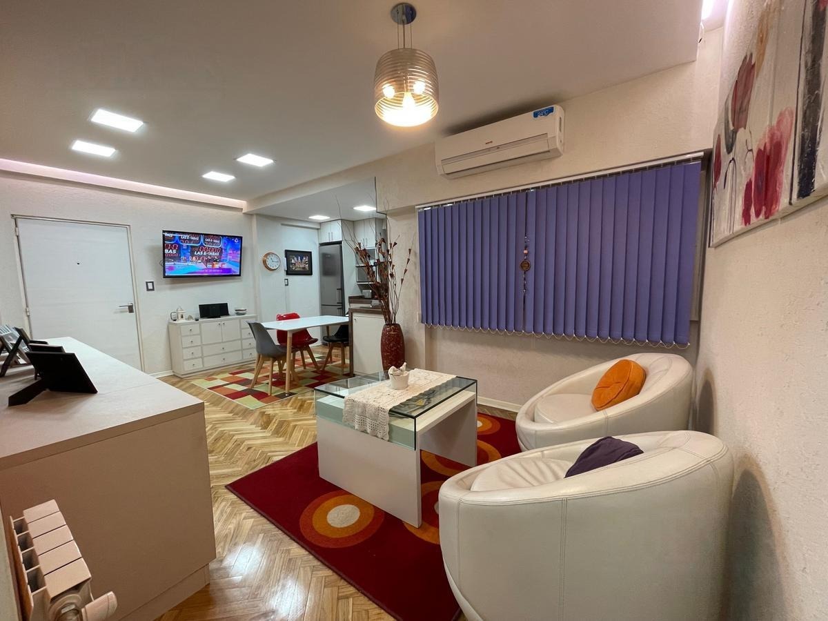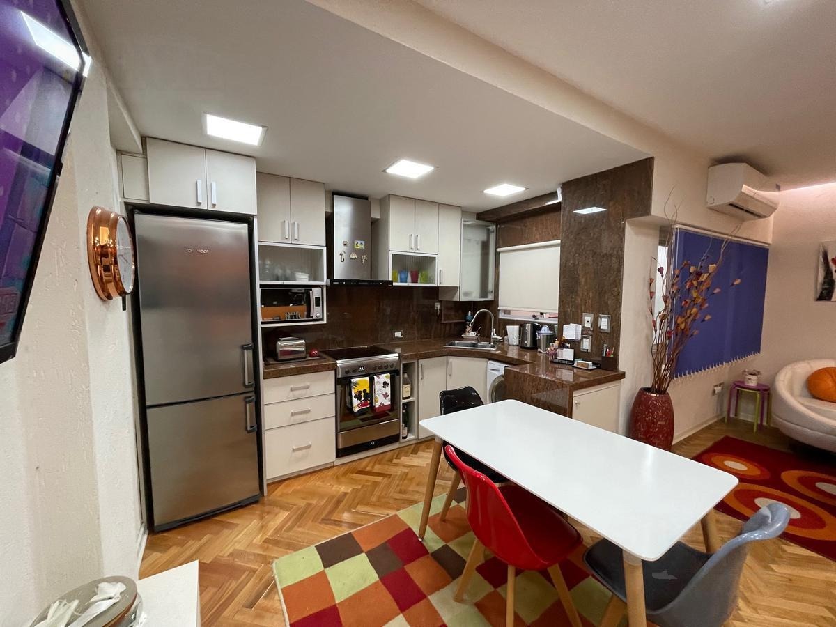 Departamento 2 ambientes refaccionado a nuevo. Amplio living comedor con piso de parquet plastificado. Cocina a nueva con muebles sobre y bajo mesada. Griferia importada, barra desayunadora, muebles a medido fijos, baño completo, dormitorio con piso de parquet. Placard y mueble a medida con split frio/calor. Instalaciones a nuevo. Apto profesional. Venta directa. Posibilidad de alquiler en cochera predio lindero. Opcional venta a convenir con muebles y equipamiento.