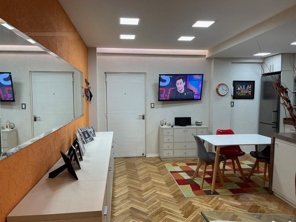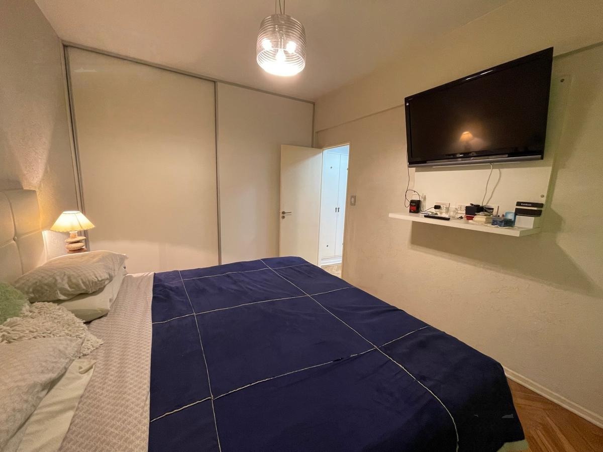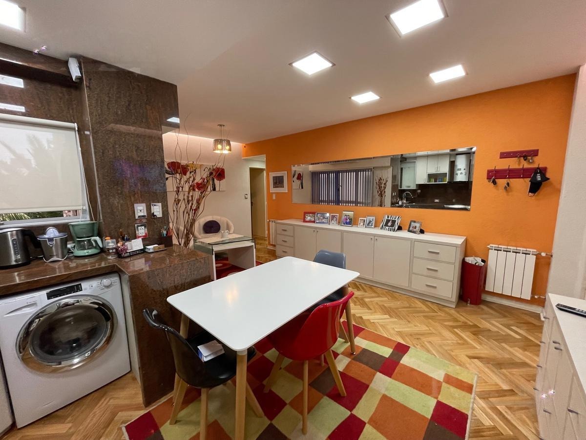 Departamento 2 ambientes refaccionado a nuevo. Amplio living comedor con piso de parquet plastificado. Cocina a nueva con muebles sobre y bajo mesada. Griferia importada, barra desayunadora, muebles a medido fijos, baño completo, dormitorio con piso de parquet. Placard y mueble a medida con split frio/calor. Instalaciones a nuevo. Apto profesional. Venta directa. Posibilidad de alquiler en cochera predio lindero. Opcional venta a convenir con muebles y equipamiento.
