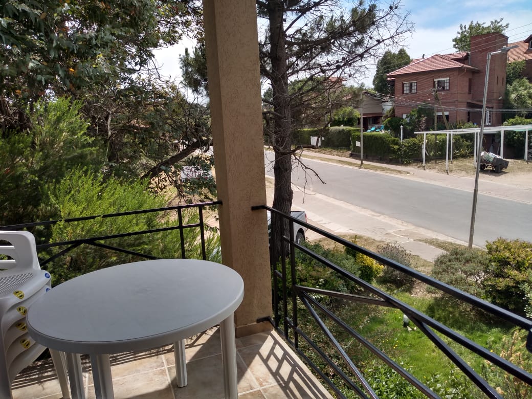 Balcón al frente con vista al parque, parrilla, mesa redonda y cinco sillones de plástico.