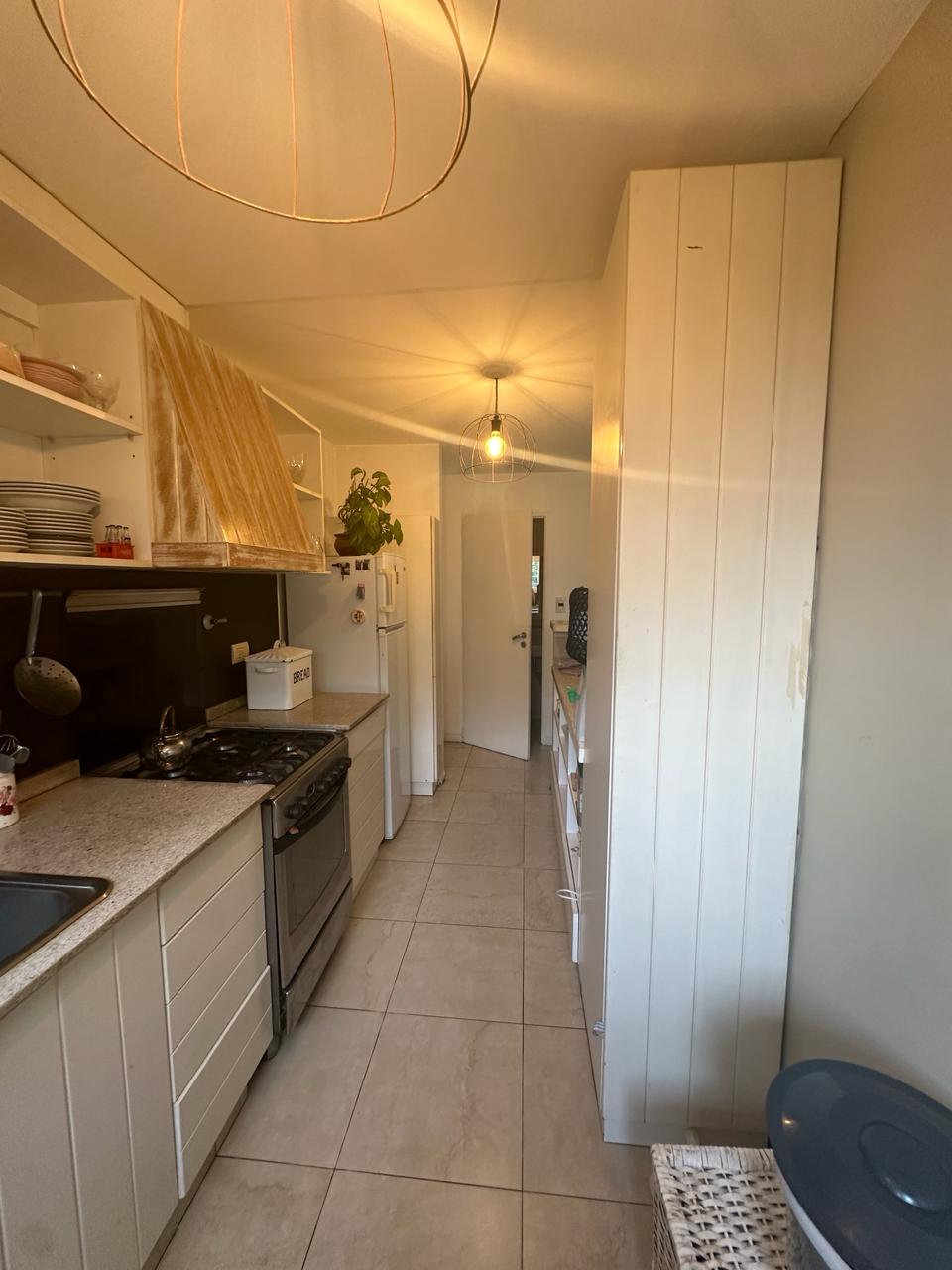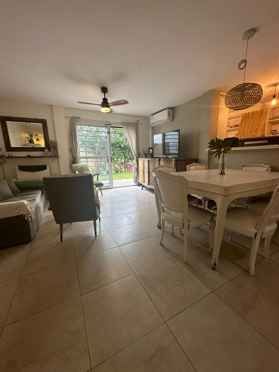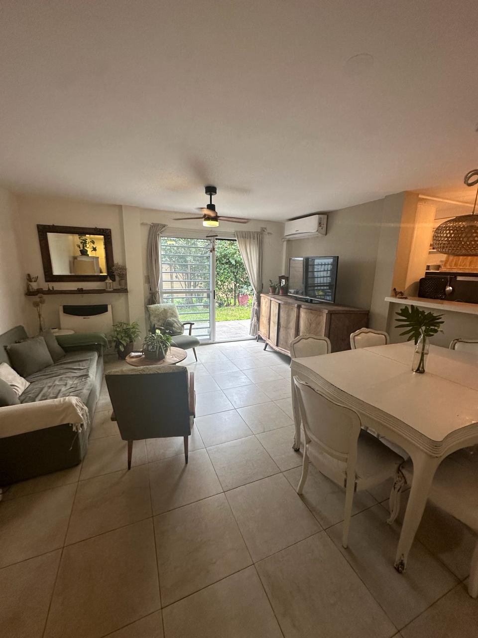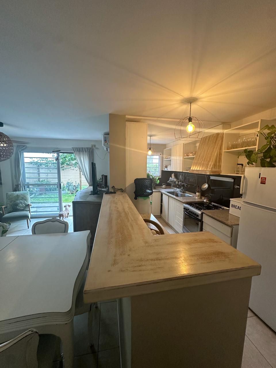Depto 4 Ambientes con cochera en planta baja. 140 mts totales 100 cubiertos. Depto de 4 ambientes consta de dos plantas planta baja con ingreso a living comedor espacioso y muy luminoso, aberturas ventana balcón con salida al jardín propio del Depto. Cocina integrada con muebles alto y bajo mesada, barra desayunadora. Mucho espacio de guardado. Baño con ducha. Gran oficina o playroom y sala de guardado con salida directo a la cochera del Depto. Estufas de tiro balanceado. Jardín de 40 mts aprox.Planta alta con escalera que lleva a pasillo distribuidor amplio con biblioteca y dos dormitorios, uno con salida a deck pequeño, baño completo con bañera. Placas eléctricas de calefacción! Cochera cubierta. Sum con jardín común