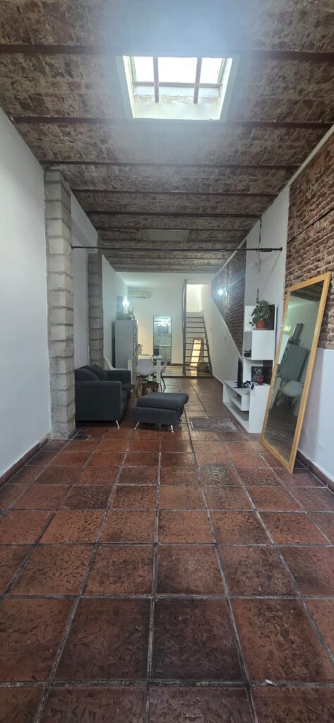 En planta baja dispone de un portón de ingreso con espacio para un vehículo, cocina al fondo con instalaciones de gas y agua, baño completo y patio trasero semicubierto.